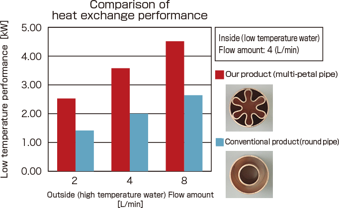 Nishiyama double pipes with multi-petal shaped inner pipes greatly increased the contact area between two liquids flowing on either side (heat transfer) without increasing the cross-section area to realize heat exchange efficiency that exceeds conventional products.