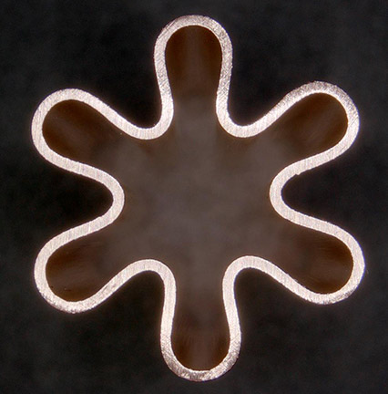 Our multi-petal heat transfer pipes and high-efficiency heat exchangers can be produced with copper alloys, stainless steel and aluminum alloys. We can make pipes for any desired corrosion resistance, thermal resistance, light-weight or other specs (for sizes, please inquire separately).